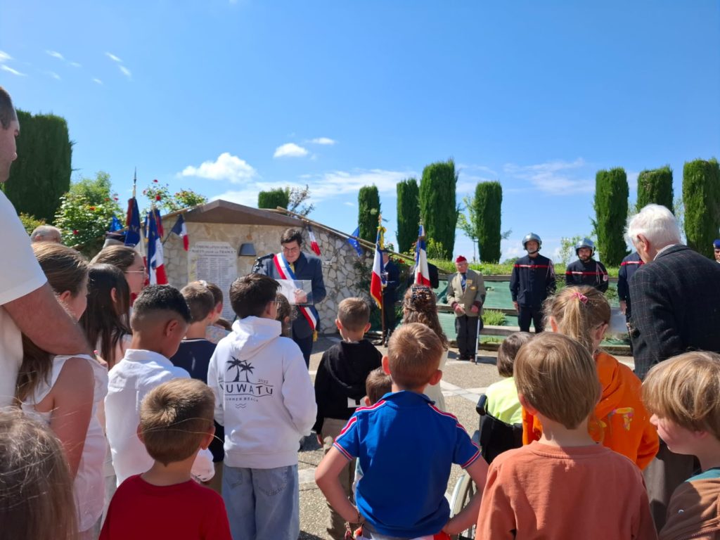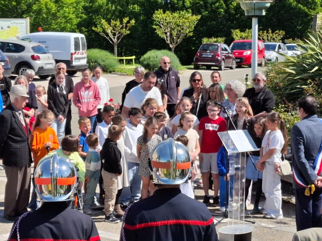 Les enfants et leurs enseignantes chantent « La Marseillaise » accompagnés de Mrs Sormail, Prayssac et Bes.